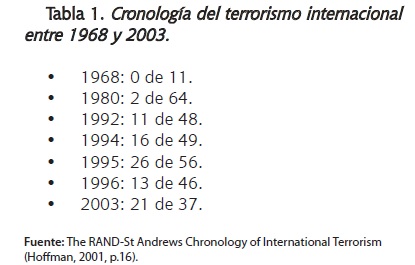 [...] a finales de los años sesenta y setenta, sobrevino una repentina explosión de terrorismo izquierdista en Europa, en Latinoamérica y en otros lugares... Los medios de comunicación, junto a algunos académicos, tendían a interpretar los eslóganes de los terroristas a través de su significado aparente, al tiempo que ignoraban la prolongada historia del terrorismo. Esto les condujo a contemplar el terrorismo como un fenómeno nuevo y sin precedentes [.]. (Laqueur, 2002, p. 89).