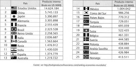 Ranking de las economías del mundo a 2012, fuente Fondo Monetario Internacional, en su publicación Perspectivas económicas mundiales,