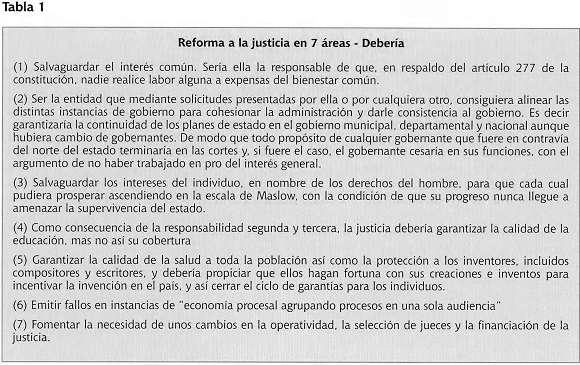 La reforma a la justicia sugerida consiste en que la rama judicial proteja la riqueza nacional, salvaguardando el bienestar común y generando empresa. Esto se lograría reformando el sistema de los derechos de autor y garantizando educación pública gratuita, funcional y de calidad así como combatiendo la corrupción, al alinear todos los poderes del estado y los ámbitos municipal, departamental y nacional en un propósito común, alrededor de las políticas de estado.