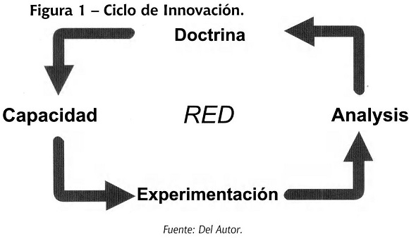En el proceso propuesto anteriormente por ese autor, la red pasa a ser la vía en la que transita toda la información inherente a los componentes del proceso: A partir de un ejercicio inicial de prospección se establece una doctrina, la cual va a definir una capacidad específica. Al realizar la experimentación de esta capacidad, el proceso de su análisis va a refinar la doctrina, y así, el proceso se reinicia, teniendo la red como fuente que proporciona la sinergia del ciclo. Consecuentemente, los productos de innovación tecnológica van modificando radicalmente las bases conceptuales del combate. El “cómo combatir” está cada vez más determinado por el soporte tecnológico y su penetrabilidad en el medio militar.