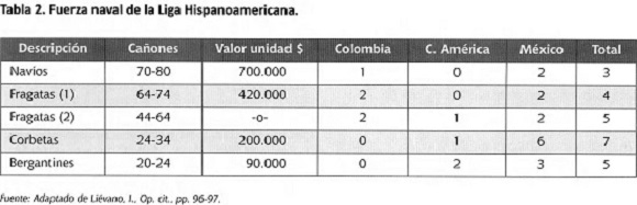 Entonces, se asumió que las fuerzas navales eran menos importantes que las terrestres para preservar la soberanía, por lo que no hubo mayor objeción para establecer una flota del Atlántico. De todas formas, se asignaron los aportes en dinero y en embarcaciones en función de la población los que sumados garantizaban la superioridad frente a un enemigo común, como se detalla en la tabla 2. Esta fuerza naval tendría un mando unificado con sede en Cartagena, y un fondo de gastos de $300.000 fuertes. Para este fondo los aportes se distribuyeron así: Colombia $85.714, Centroamé-rica $37.046 y México $177.000.63 La amenaza naval europea sobre el Pacífico era menos significativa lo que explica, en parte, que Perú no hiciera aportes en este sentido. Al final, la ratificación de los tratados en cada país no prosperó, como tampoco los acuerdos sobre comercio regional avanzaron. Así, en 1829, el gobierno de Estados Unidos se vanagloriaba ante su representante en España de haber evitado que Colombia y México hubieran tomado Cuba y eliminado allí la esclavitud.64