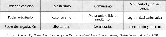 53 Es una matriz de relaciones que desarrolla Rummell. a partir de diversos estudios que comprueban la eficacia de la democracia como régimen que disminuye la violencia. Op. cit. Rummell.