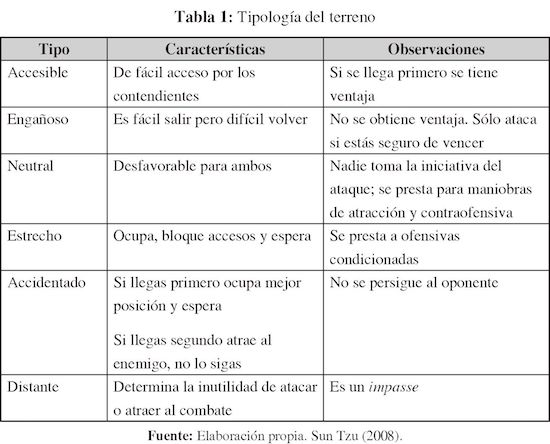 A pesar de que gran cantidad de conceptos pueden parecer muy avanzados, son tan antiguos como la historia militar, y han sido adaptados a las circunstancias del momento histórico. Esto sirve como justificación para hablar de la clasificación del terreno9 establecida por Sun Tzu y su potencial adaptación al mundo del presente. De acuerdo con la tipología propuesta por Sun Tzu (2008: p. 109) los tipos de terrenos se clasifican en: