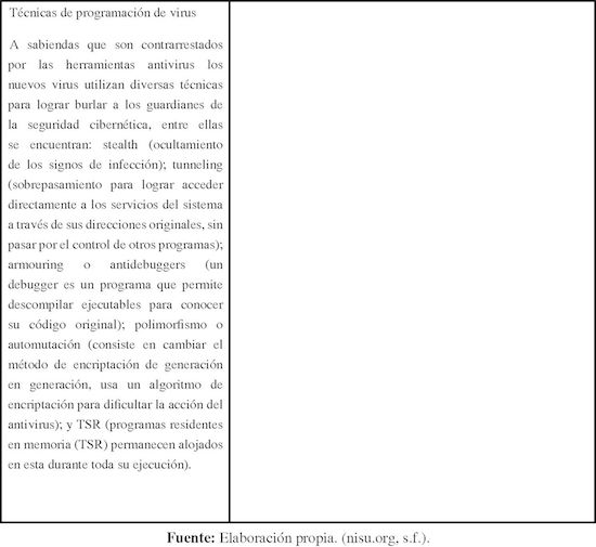 Las ciberarmas se pueden clasificar de acuerdo con su alcance, método de implantación y propósito. Entre los más importantes son: virus, gusanos, programas maliciosos17, bombas lógicas, botnet, programas espía (spyware), backdoors y troyanos. Para el efecto se incluye una breve descripción de algunas de las ciberarmas arriba mencionadas, con base en la información presentada por la compañía de ciberseguridad Panda Security (s.f.).