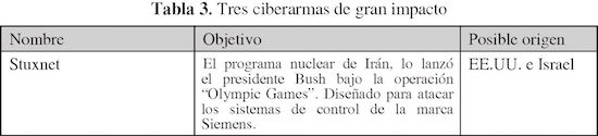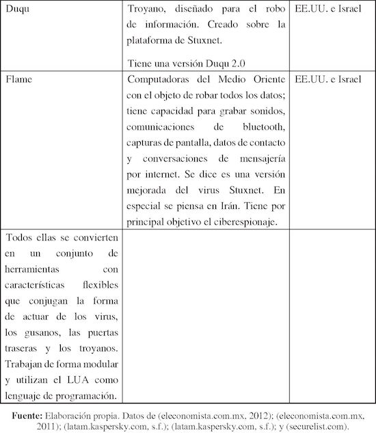 Por otro lado, tres de las ciberarmas que han generado mayores daños, en años recientes, a la infraestructura de las naciones atacadas son: Stuxnet, Duqu y Flame. Dichas armas han sido utilizadas con efectividad en cada uno de sus casos logrando sus objetivos con creces y por años sin ser descubiertos. Tal es su complejidad y sofisticación que incluso de acuerdo con un comunicado conjunto de prensa de Kaspersky Lab e ITU (2012) son consideradas como “super-ciberarmas”. Lo cual equivale a tener ciberarmas de grandes proporciones y potencialmente de destrucción masiva, como ha sido sugerido anteriormente en este trabajo.