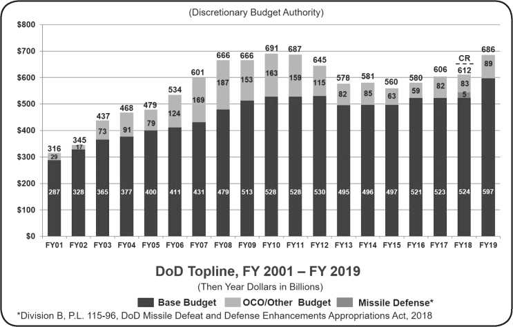 De acuerdo con Michael O’Hanlon (2017), investigador senior del Brookings Institution, el presupuesto de la defensa estadounidense promedio durante la Guerra Fría, si se ajusta la inflación y expresa en dólares de 2017, fue de aproximadamente $525 mil millones de dólares, incluyendo los costos nucleares del Departamento de Energía. El presupuesto promedio para la defensa en los últimos años está en el orden de los 600 mil millones de dólares anuales aunque las fuerzas han sido reducidas en un 35 a 40 por ciento. Esto significa que estamos hoy por encima del promedio de la Guerra Fría. Buena parte de la razón es: costos mucho más elevados en personal (fuerza voluntaria), tecnología más costosa y el hecho de que estamos haciendo muchas más cosas, mayor número de misiones de alto costo, además del envejecimiento de los equipos (lo cual incrementa el costo del mantenimiento) y una infraestructura que requiere ser renovada para el tamaño de la fuerza. (Ver figura 1).
