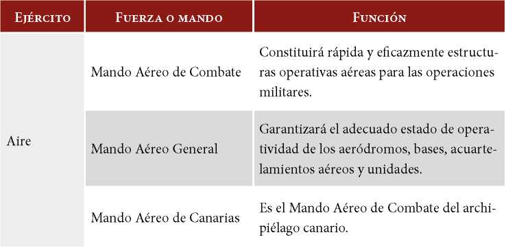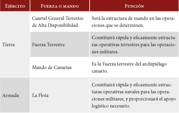 En segundo lugar, la Fuerza es el conjunto de medios humanos y materiales agrupados y organizados para disponerse a realizar operaciones militares, y que está organizada por capacidades para permitir la preparación y la evaluación de las distintas unidades y facilitar su transferencia a la estructura operativa de las Fuerzas Armadas. La Fuerza de cada ejército se compone de las fuerzas y los mandos que se muestran en la tabla 1.