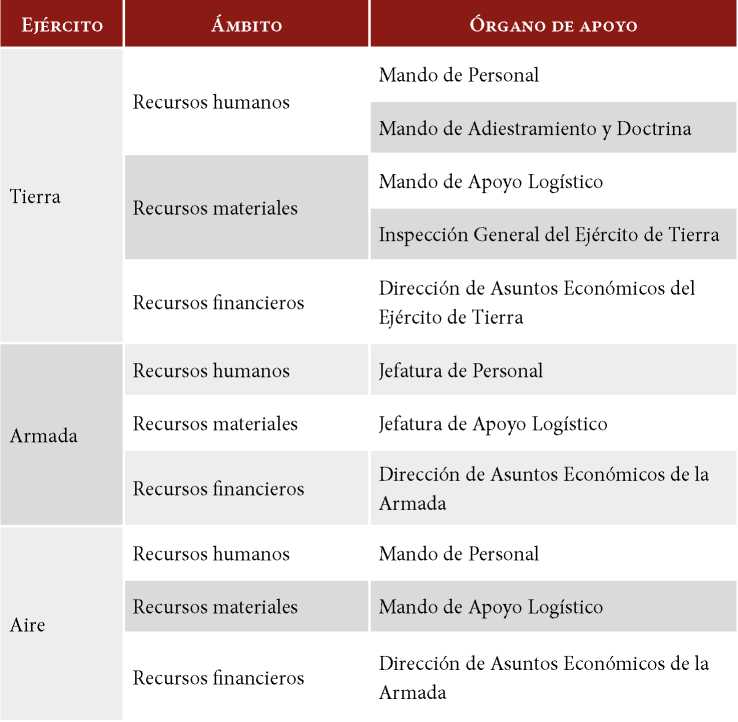 En la tabla 2 se reflejan los diferentes órganos de apoyo de cada ejército, desglosados según su ámbito de actuación.