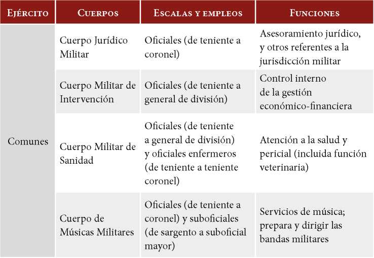 Como se puede evidenciar, en las Fuerzas Armadas pueden existir diversos cuerpos, específicos de los distintos componentes o comunes para todos ellos. Todos los miembros que constituyan las Fuerzas Armadas Españolas deben estar integrados a un Cuerpo, específico o común, dependiendo de las funciones que tengan encomendadas (art. 10.3 LODN).