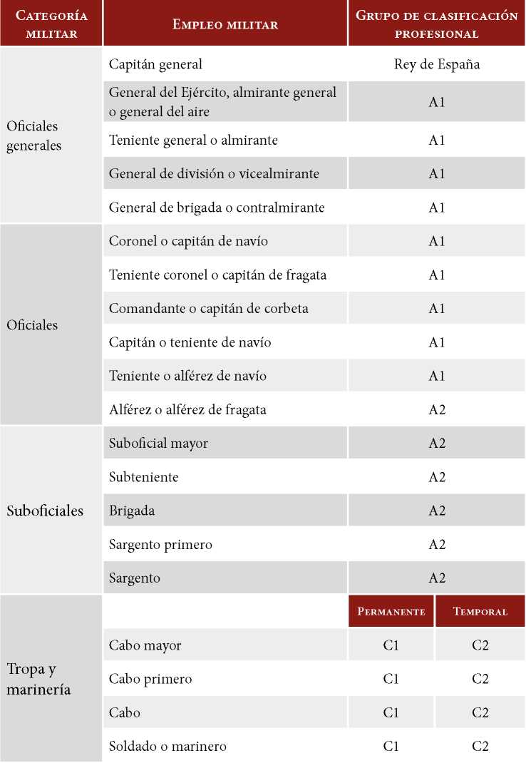 Todos los militares pertenecientes a las Fuerzas Armadas Españolas se encuentran encuadrados dentro de alguna de las siguientes categorías: