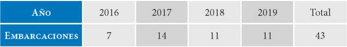 Ahora bien, desde 2017, el tráfico ilícito de drogas en el departamento ha aumentado con la salida de embarcaciones desde la Media y la Alta Guajira; según cifras del Ministerio de Defensa Nacional, entre 2016 y 2019 salieron 43 embarcaciones con drogas, como se puede apreciar en la tabla 1.