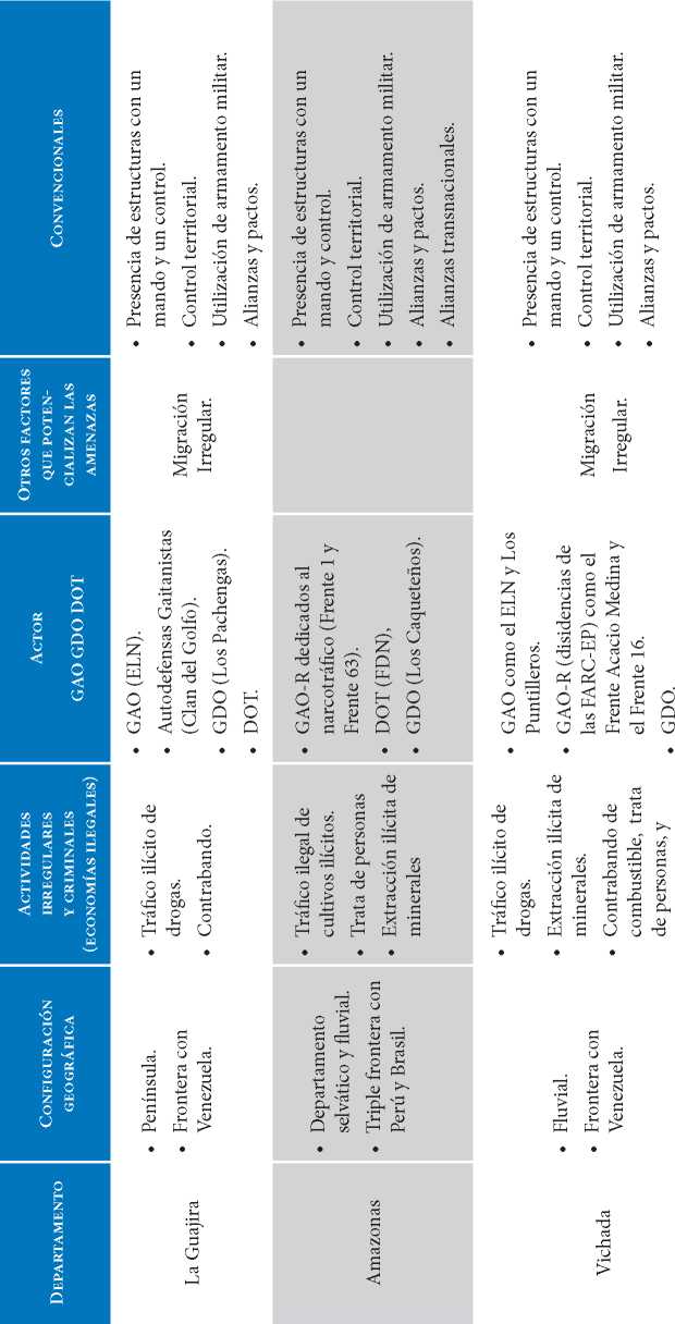 Dadas las condiciones geográficas de los departamentos estudiados, se presentan dinámicas territoriales de seguridad diferenciadoras, y ante lo cual las amenazas híbridas se potencializan. Por ejemplo, ante la condición geográfica de La Guajira, la economía ilegal que sobresale es el contrabando, y en los últimos años se ha evidenciado un aumento de embarcaciones que salen con droga hacia el mar Caribe. En los departamentos de Amazonas y Vichada, por su condición geográfica, esencialmente fluvial, los ríos son utilizados para transportar drogas ilícitas, y así el narcotráfico se configura como la actividad principal ilícita utilizada por los GAO. Así mismo, en departamentos como La Guajira y Vichada la migración irregular ha aumentado, y eso ha generado problemas de inseguridad; en parte, también, por el rezago en indicadores socioeconómicos como el empleo, la salud, la vivienda y la educación, tal cual fue señalado por el estudio del Banco Mundial.