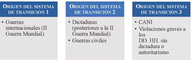 En consecuencia, el tipo de medidas para superar grandes crímenes, en términos amplios, también ha sido conocido como ‘justicia de transición’ (ONU, 2004), ‘justicia en épocas de transición’ (Benavides, 2013) y ‘justicia posconflictual’ (Bassiouni, 2002), como se indicó en párrafos precedentes; términos que solo se pueden entender adecuadamente desde un enfoque puntual sobre el tipo de violencia del pasado que se quiere superar; es decir, bien sea la existencia de dictaduras y regímenes autoritarios o totalitarios en concreto, o de un conflicto armado internacional o interno, incluso si la transición se origina en casos de violaciones graves de los DD. HH., sin que sea producida en las situaciones de violencia descritas (Teitel, 2000), tal y como se muestra en la siguiente figura: