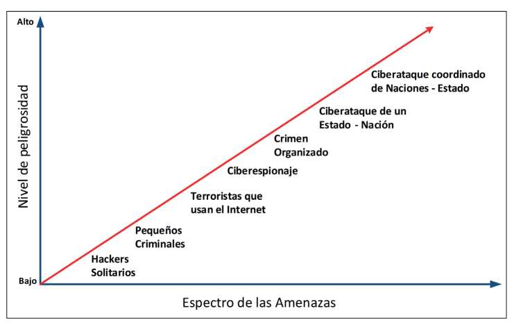 Para analizar las amenazas cibernéticas es importante enfocarse en términos de su origen, es decir, de donde provienen. Las ciberamenazas pueden derivarse de un espectro amplio de fuentes, que van desde una sola persona como un hacker solitario, pasando por un empleado descontento, los cibercriminales y ciberterroristas y llegando hasta el empleo de las capacidades de una o varios Estados-nación para conducir un ataque encubierto, coordinado y dinámico a un adversario. En tal virtud el impacto potencial de este ataque cibernético aumenta y puede causar daños considerables a las infraestructuras tecnológicas de un país. Este espectro de amenazas se puede esquematizar en la figura 1, contrastando su nivel de peligrosidad, siendo los menos peligrosos los hacker solitarios que buscan más reconocimiento y notoriedad y llegando a amenazas promovidas por Estados que tienen un alto grado de sofisticación y destrucción.