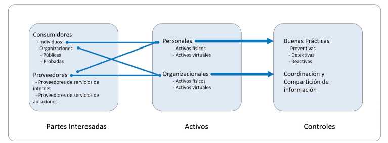 Es importante destacar que en el año 2014, el Instituto Ecuatoriano de Normalización - INEN, publica la Norma Técnica Ecuatoriana NTE INEN-ISO/IEC 27032, que una traducción idéntica de la norma internacional ISO 27032:2012. (INEN, 2014), cuyo enfoque general se puede resumir en la figura 3, que se muestra a continuación.