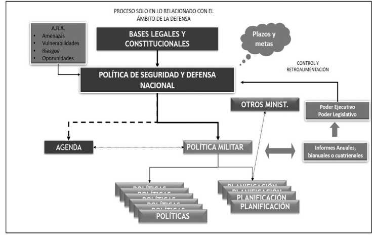 A elaboração de políticas de defesa é uma tarefa que todo Estado moderno deve enfrentar a partir das demandas crescentes de transparência, e a tendência geral de ter respostas no ambiente de segurança caracterizado pelo grande grau de incerteza que enfrentamos hoje, onde somente atores estatais internacionais coexistem, já que devemos considerar também os atores difusos não estatais que geram outros tipos de ameaças que o Estado deve proteger contra todos os elementos do Poder Nacional. Há também casos como o do Chile, nos quais, por várias razões, o desenvolvimento de políticas ou estratégias de segurança nacional não é viável, e não se aglutinam em seu ambiente político. É por isso que para lidar com a miríade de situações, que não só afetam a defesa do desenvolvimento de uma Política Segurança e Defesa, o que permitiria antecipar e resolver esta atmosfera difusa e capacitação Polícia Militar, a preparação é proposto e organização das forças militares para cumprir as tarefas que esta Política de Defesa e Segurança lhe oferece.