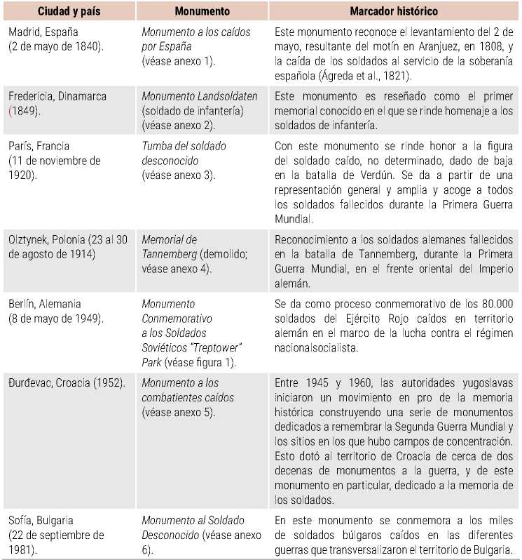 Ambos procesos de reconocimiento son un avance en la construcción de una memoria histórica humanizadora en los militares; sin embargo, para el presente estudio haremos una compilación de los monumentos públicos que existen en Europa cuya significancia simbólica trasciende la imagen del mausoleo. En la tabla 1 señalaremos algunos de los monumentos de mayor importancia para el reconocimiento de los soldados caídos a lo largo de continente europeo.