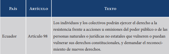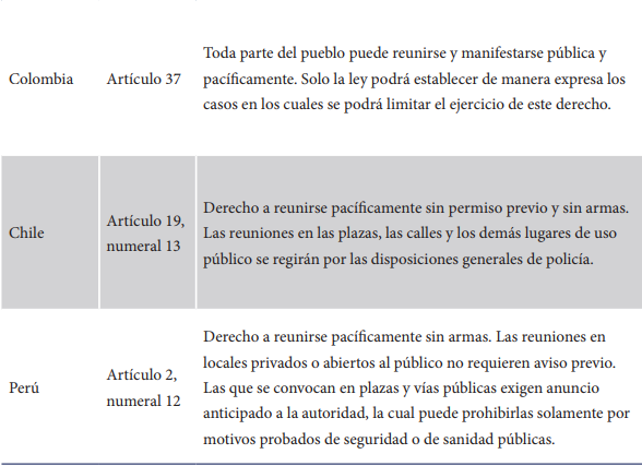 Fuente: elaboración propia, con base en: Constitución de la República del Ecuador (Art. 98) de la Asamblea Nacional de la República del Ecuador (2008), Constitución Política de Colombia 1991 (Art. 37), Constitución Política de la República de Chile (Art. 19) en Senado de Chile (2019) y Constitución Política de Perú (Art. 12) de Presidencia de la República de Perú (1993).