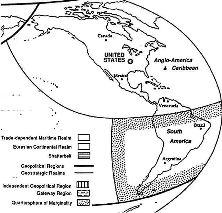 Tal sistema, que se consolidó en 1942 con la JID y la declaración de seguridad colectiva, desde 1947, por el Tratado de Río, en realidad sirvió para fortalecer el perímetro de seguridad estadounidense, y para contener el comunismo en la región. Con la Posguerra Fría, mientras la OTAN buscó expandirse, el sistema interamericano cedía ante proyectos geopolíticos divergentes; de hecho, Cohen (2009) alude a la región geopolítica Suramérica como la definida físicamente desde el Amazonas hacia el sur (también conocida como Cono Sur, según se muestra en la figura 4), y donde Brasil es el poder dominante. La región, además, tiende al fraccionamiento físico, debido a la cordillera de los Andes, entre una franja occidental y otra oriental; un fraccionamiento que en lo comercial evidenció el declive de la Comunidad Andina, mientras desde 1991 el Mercado Común del Sur (Mercosur) tendió a crecer.