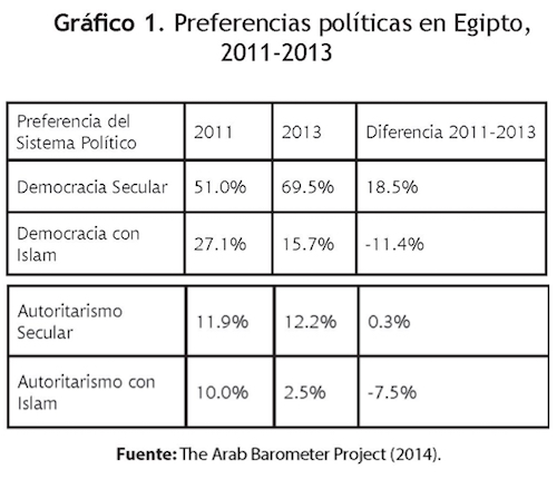 En Egipto, así como en muchos países de la región, el Islam sirvió como elemento catalizador de grupos en busca de libertades. Mientras tanto el régimen insistía en la implantación de un modelo de modernidad occidental. El modelo autoritario originó centros de poder alternos al Estado como los movimientos islamistas tanto moderados como yihadistas, que son capaces de conformar un proyecto político pese a los múltiples obstáculos que les impone el régimen militar (Ghalioun, 1999).