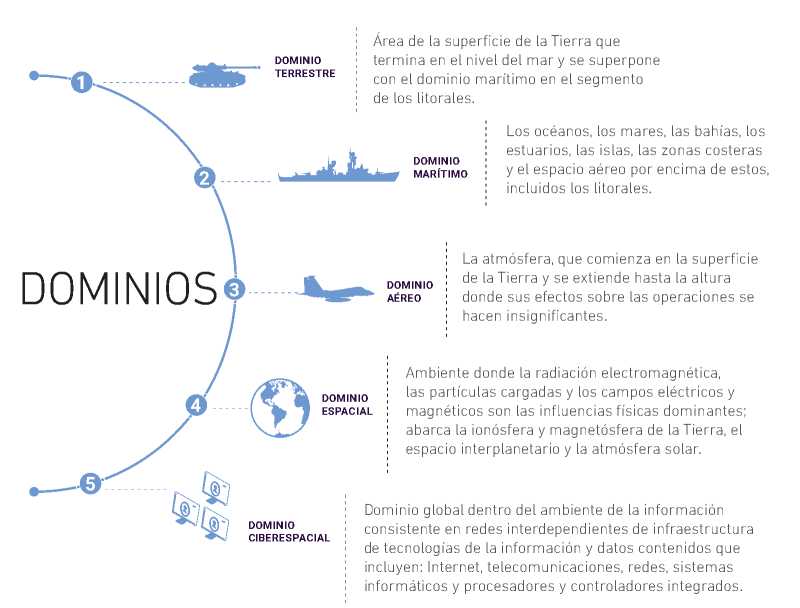 El tercer dominio es el dominio aéreo, el cual comprende la atmósfera, que comienza en la superficie de la Tierra y se extiende hasta la altura donde sus efectos sobre las operaciones terrestres o navales se hacen insignificantes. El cuarto dominio es el dominio espacial, que es el ambiente donde la radiación electromagnética, las partículas cargadas y los campos eléctricos y magnéticos son las influencias físicas dominantes; abarca la ionósfera y la magnetósfera de la Tierra, el espacio interplanetario y la atmósfera solar. Y el último, y con base en el cual este artículo aborda las pretensiones de China, es el dominio ciberespacial, que es concebido como un dominio global dentro del ambiente de la información4; este último, consistente en redes interdependientes de infraestructura de tecnologías de la información y datos contenidos, que incluyen: internet, telecomunicaciones, redes, sistemas informáticos y procesadores y controladores integrados.