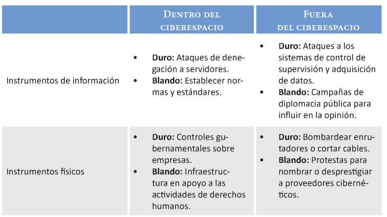 De igual forma, Nye (2010) describe el poder cibernético como un régimen híbrido único, con propiedades físicas (infraestructuras, recursos, reglas de soberanía y jurisdicción) y propiedades virtuales, como se muestra en la tabla 1; estas últimas, con capacidad para dificultar el control gubernamental sobre las propiedades físicas. Bajo este concepto, pueden llevarse a cabo ataques de bajo costo desde el campo virtual o desde el ambiente de la información, y con ellos generar altos impactos y costos en el ambiente físico, debido a la estrecha relación entre los dos. Ahora bien, con el planteamiento de Nye (2010), lo opuesto también es cierto: el control sobre el ambiente físico puede tener efectos territoriales y extraterritoriales sobre el ambiente virtual.