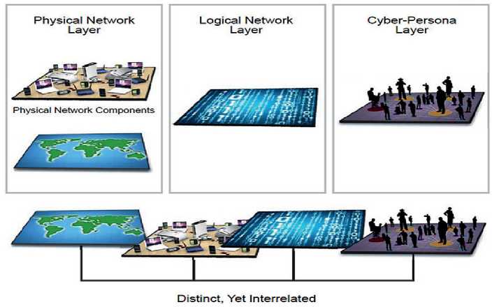 Como lo planteaba Nye (2010), el poder cibernético tiene unas dimensiones físicas (infraestructuras, recursos, reglas de soberanía y jurisdicción) y unas dimensiones virtuales. Bajo esa misma óptica, Patrascu (2019) apelando a los planteamientos de la Organización del Tratado del Atlántico Norte (OTAN), sostiene que el ciberespacio cuenta con tres niveles, descritos en la figura 2.
