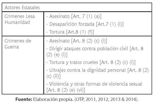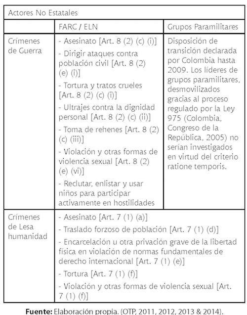 No obstante, la OTP considera tener la información suficiente para creer que crímenes de competencia de la Corte han sido cometidos. Para ello ha identificado actores que, determinados en razón al conflicto armado de carácter no internacional y con base en la información recibida, presuntamente serían responsables de crímenes de guerra y de lesa humanidad. De esta manera, la OTP ha dividido los actores en (i) no estatales (Farc y Eln) y (ii) estatales.