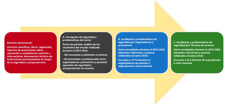 El método de recopilación de datos es mixto, pues contempló la utilización de técnicas e instrumentos cualitativos y cuantitativos. La investigación ofrece un enfoque multidisciplinar basándose en las experiencias de individuos, tanto si asisten a eventos como si ejercen su actividad profesional en la industria; en concreto, brinda las perspectivas de organizadores y promotores de eventos, de personal operativo de seguridad y auto-protección, y de técnicos en la producción de espectáculos, así como la de los propios asistentes a los eventos multitudinarios.