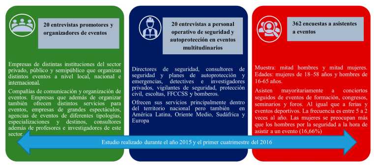 Como punto de partida, se analizan los resultados de un estudio hecho durante 2015 y el primer cuatrimestre de 2016. En al ámbito cualitativo, la muestra obtenida corresponde a 40 entrevistas semiestructuradas, que se aplicaron a organizadores y promotores de eventos (20 personas) y a personal operativo de seguridad y autoprotección (20 personas). A través de un formato con preguntas abiertas, cerradas y multirrespuesta, se abordan ejes temáticos sobre la previsión de riesgos y amenazas durante la planificación de los eventos. Como técnica cuantitativa, dentro del mismo estudio se asimilan los resultados de 362 encuestas de tipología similar a las anteriores, que persiguen conocer la percepción de la seguridad vista por asistentes a encuentros multitudinarios.