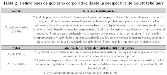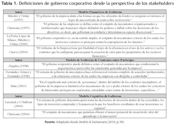 Para avanzar en la conceptualización sobre el tema, a continuación se muestran algunas definiciones de gobierno corporativo con el objetivo de contextualizar e identificar elementos comunes en ellas desde la perspectiva neo institucional (Tabla 1).