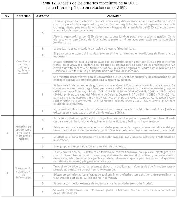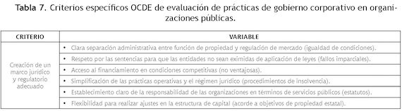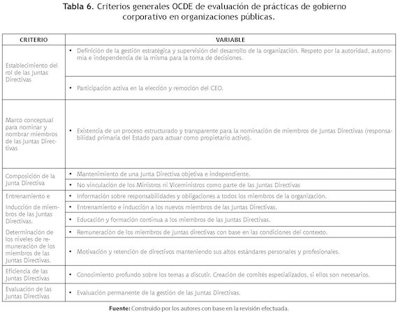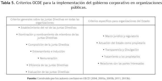 Con base en los aspectos planteados previamente, a continuación se indican las directrices de la OCDE que se requerirían para evaluar un enfoque integral del gobierno corporativo en las organizaciones del Estado (7 criterios sobre las responsabilidades de las juntas directivas y 5 criterios específicos para organizaciones públicas) (Tabla 5) y que fueron la base con la cual se evalúa el estado del actual del gobierno corporativo para el caso del GSED (para las variables que componen cada uno).