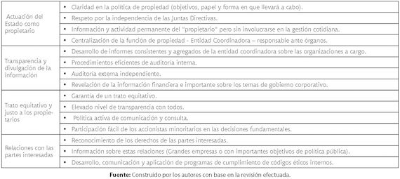 En este marco los derechos de propiedad tienen la intención principal validar si los accionistas y demás participantes pueden hacer ejercicio pleno y oportuno de sus derechos de propiedad; el Directorio o Gerencia busca establecer si los esquemas de dirección están bien delimitados y si cuentan con mecanismos amplios y eficaces de seguimiento; y la transparencia pretende que la información que suministra la empresa sea completa, relevante, veraz, objetiva y oportuna.