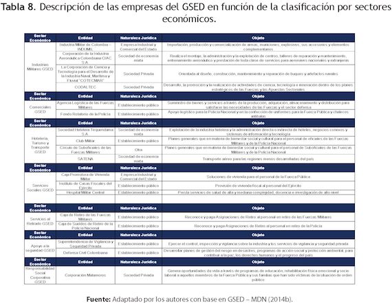 El GSED se encuentra organizado desde el año 2008 en tres (3) unidades de negocio (o clústeres): apoyo logístico, bienestar y apoyo a la seguridad que le ha permitido atender a las necesidades estratégicas del Sector Defensa y apoyar su propósito superior (GSED - MDN, 2014b; Oportunidad Estratégica, 2007). Sin embargo, recientemente la organización creó una subcategoría que permitiera analizar las diferentes entidades bajo un enfoque de sectores económicos (Tabla 8).