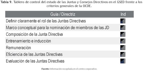 Para mostrar el resultado del análisis se presenta un mecanismo gráfico que permitiera evaluar cada uno de los aspectos en función de su cumplimiento para todo el grupo. Dado que se trata de una visión conjunta de los entes que conforman el sistema de gobierno corporativo del GSED no se ha desarrollado el tablero de control específico para cada entidad. El análisis presentado se construyó con base en datos que se encuentran en el centro corporativo, algunos criterios identificados por los autores en la revisión de los diferentes procesos de mejoramiento de gobierno corporativo del GSED y se dividió en dos grandes grupos: evaluación con respecto a las Juntas o Consejos Directivos y evaluación sobre los aspectos específicos de la OCDE para el sector público.