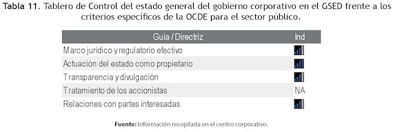 A continuación se presenta el tablero de control que corresponde a la evaluación de los aspectos de gobierno corporativo OCDE determinados para las organizaciones públicas en relación con el caso estudiado (ver Tabla 11)