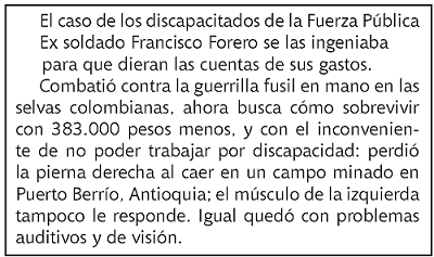 Cuando la Constitución Política de Colombia (1991), en sus Artículos 13,44,45,46,47,48,49,50,51,54 y 67 definen los principios para una política general de coordinación de acciones integrales, multisensoriales y multidisciplinarias, orientadas hacia la equiparación de oportunidades para las personas con discapacidad, ontológicamente está declarando inclusión plena sin excepción de personas. Así, acogiéndose a este precepto, la revisión de las leyes para los miembros de la Fuerza Pública heridos en combate, tiene en la Directiva Permanente Na0005 del 2001 Apoyo al personal Herido en Combate evacuado al Hospital Militar Central un derrotero para derivar de ahí otras aristas de análisis y efecto.