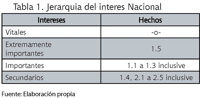 Considerando los cuatro niveles de una escala de prioridad para el interés nacional, a saber: a) intereses vitales; b) intereses extremamente importantes; c) intereses importantes; d) intereses secundarios (Commission, 2000, pp. 5-8). Una clasificación de los 10 hechos listados arriba en función de su afectación sobre Colombia, podría verse del modo siguiente: