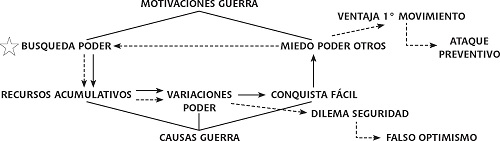 La búsqueda permanente de poder (Motivación1), conlleva a que los Estados intenten adquirir recursos acumulativos, los cuales otorgan poder y ayudan a mantenerlo (Causa 1). Debido a que en esa búsqueda de poder algunos países logran adquirir mayores recursos que otros, se presentan variaciones en el poder relativo de los Estados, lo que abre ventanas de oportunidad y vulnerabilidad (Causa 2). La apertura de estas ventanas hace que las aventuras de conquista sean más probables (Causa 3). El miedo a la conquista, es decir, el temor al poder de los otros (Motivación 2), puede desencadenar dos situaciones diferentes: una en la que la ventaja radica en realizar el primer movimiento, lo que aumenta las posibilidades de un ataque preventivo (Causa 4); y otra en la que se pretende compensar el desequilibrio, reiniciando el ciclo de búsqueda de poder propio con el objetivo, esta vez, de hacer que la aventura de conquista por parte del otro sea difícil, lo que conduce al clásico dilema de seguridad6, el cual se rompe cuando alguno de los Estados cae presa del falso optimismo y espera una victoria en la guerra (Causa 5).